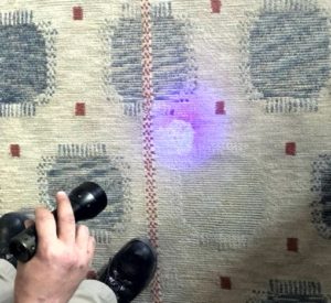 When a rug is brought into our studio with noticeable pet urine odour, or just a suspicion of pet urine deposits, we use black light technology which causes the pet stained areas to glow. This allows us to specifically target the source of the odour-causing bacteria and completely eliminate embarrassing pet urine odours.